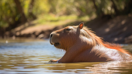 AI Generated. Capybara relaxing in muddy water surrounded by greenery
