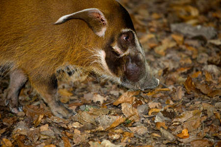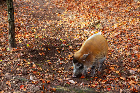 Red river hog in autumn . Pig in autumn leaves