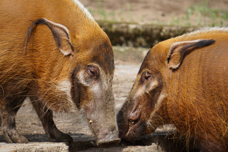 The two big and brown wild swine touching their snouts to each other