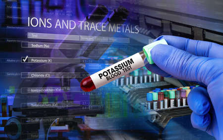 lab technician with blood tube and hematology analyzer equipment of laboratory and screen with data of Hemogram and Reference values. Doctor with tube of blood of patient for analysis named Potassium