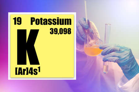 Potassium. Cell with symbol of potassium next to hands of a laboratory assistant. Potassium logo in periodic table. Chemical reagent experiments. Minerals Experiments with alkali metals.