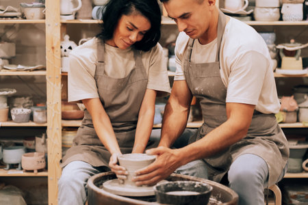 Craftswoman in apron shaping clay bowl with boyfriend together in ceramic workshop