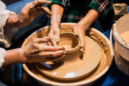 Mother teaches son to work on pottery wheel. Close up of dirty hands sculpting clay.