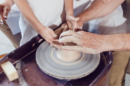 Two people mold a clay pot from white clay. Master potter teach from clay in workshop close-up