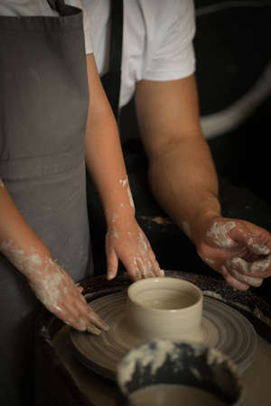 Hands close-up, men and women, a date in a pottery workshop, working together on one potter's wheel. high quality photo