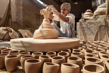 Bikaner, India - February 12, 2019: Indian potter making clay pots on pottery wheel in Bikaner. Rajasthan