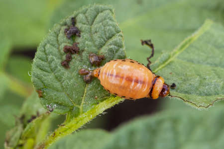 Colorado potato beetle larva eats potato leaves. Insect excrement.