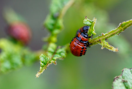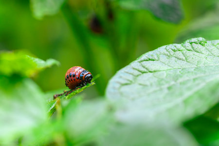 A larva of the Colorado potato beetle is seen munching on the vibrant green leaves of potato plants in a summer garden highlighting the impact of this pest on crops.