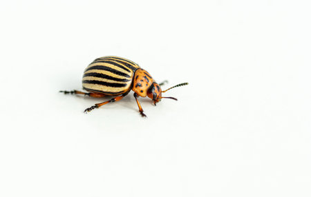 Close-up of a colorado potato beetle, a striped pest insect, isolated on a clean white background. Perfect for illustrating pest control, agriculture, and entomology concepts.