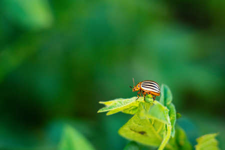 The Colorado potato beetle sits on a potato and looks at green leaves. Image contains copy space.