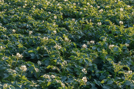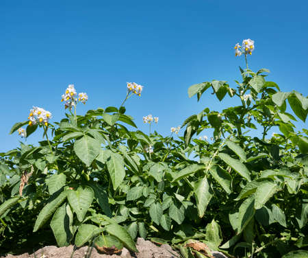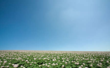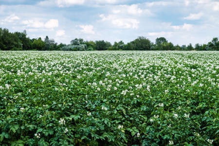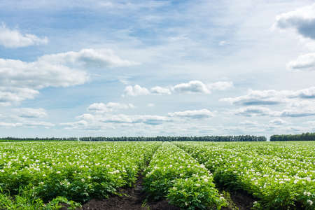 Potatoes blossom in the field, agricultural background