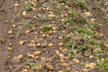 Fresh potatoes on ground. Freshly dug organic potato vegetables lie on moist, loose ground with tops. Gardening and farming. Agricultural production. Bountiful harvest Growing food on the farm field.