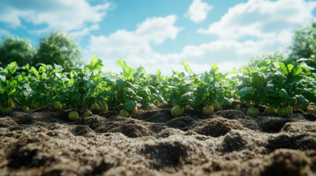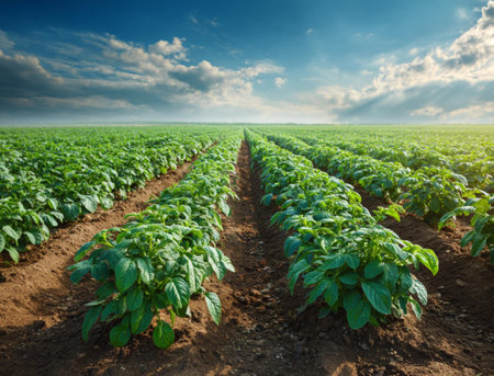 Rows of healthy potato plants thrive in dark soil while clouds drift across the sky on a warm summer afternoon in the countryside