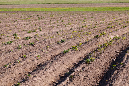 potato plantations grow in the field. vegetable rows. farming, agriculture. Landscape with agricultural land. crops