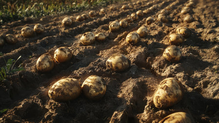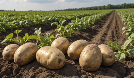 row of fresh raw potato on land