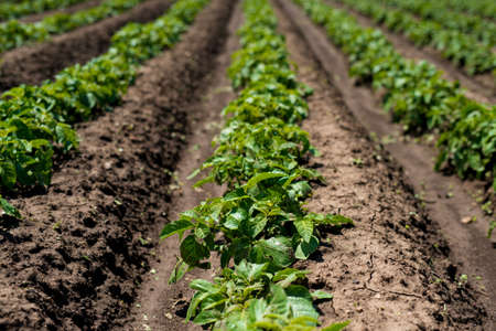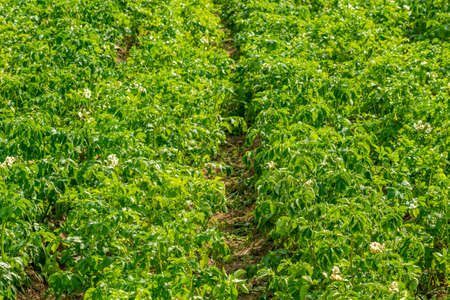 Potato field on a sunny summer day. Agriculture, cultivation of vegetables.
