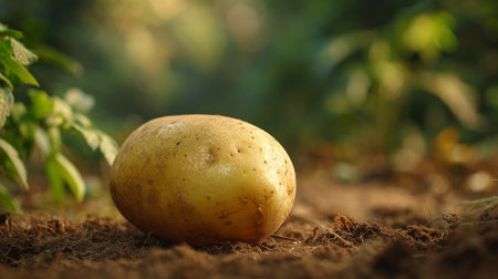 Potato close up. Freshly harvested potato on soil with roots. Organic potato, home gardening. Small farm potato harvest, fresh from the ground.