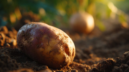 Potato Harvest in Autumn Golden Potato in the brown dry earth in October in Europe