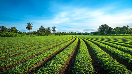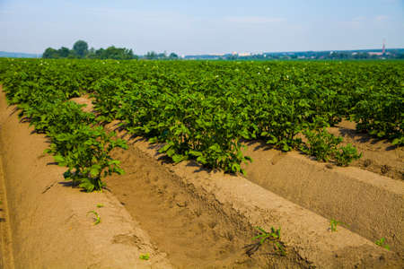 Agricultural field with even rows of potato in the summer. Growing potatoes. Blue sky in the background