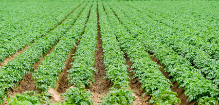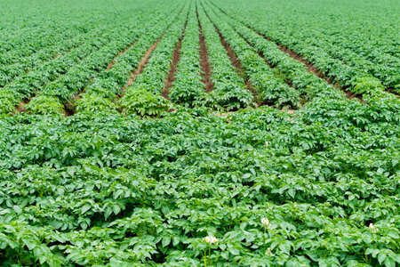 Green field potato plant in organic farm.