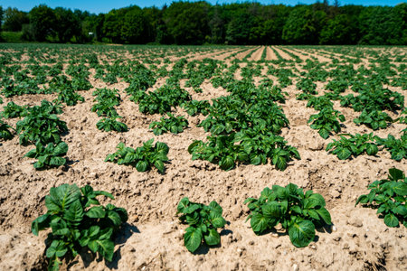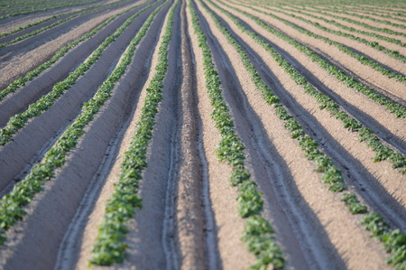 Agriculture in Netherlads, farm sandy fields with growing young potato vegetables plants
