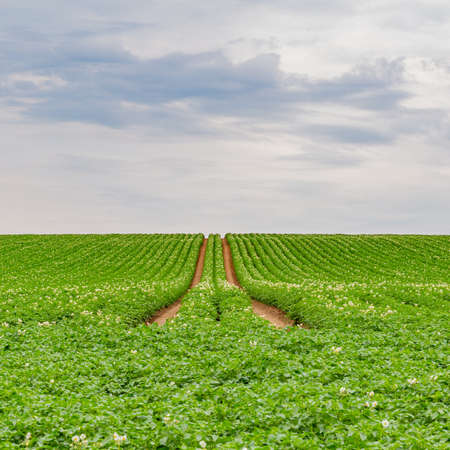 Potato crop in a green field with small white flowers with two furrows defined between the crop, cloudy day with a blue sky with abundant white clouds on the horizon in South Limburg, the Netherlands