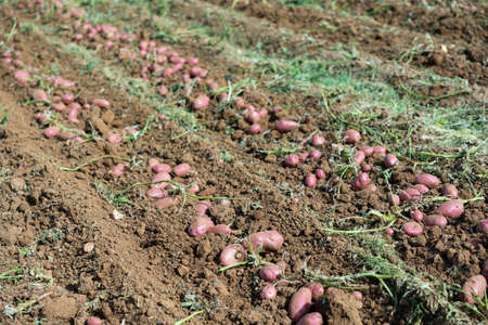 View of just gathered organic potatoes on the ground