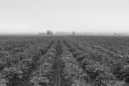 The heavy mist has covered the potato fields in the rural Finland. The distant barn houses stand out in the white landscape.