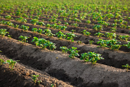 Potato field with green shoots of potatoes