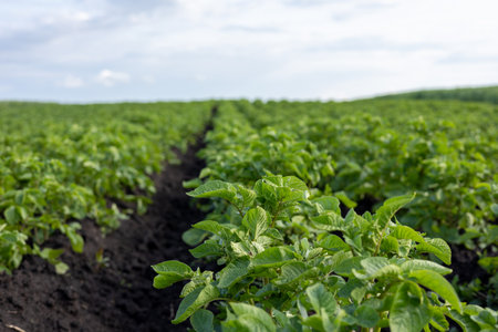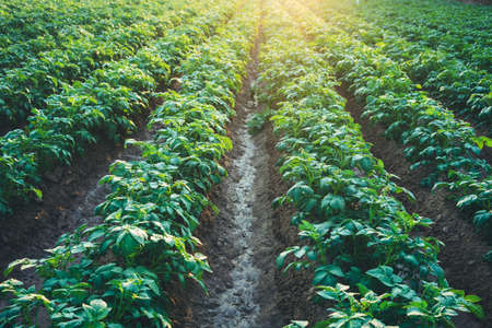 Potato field with green plants, growing potatoes as a food product