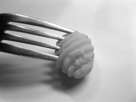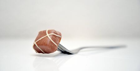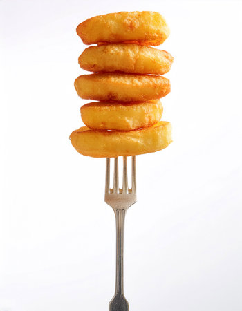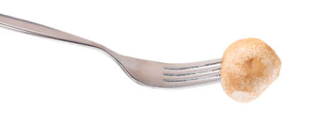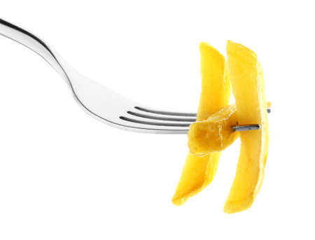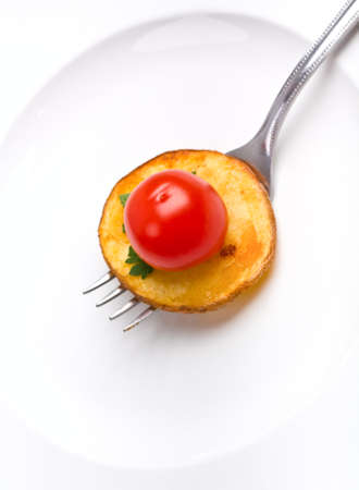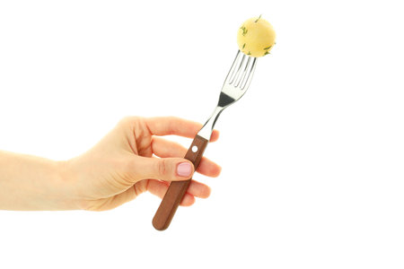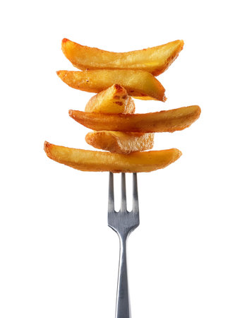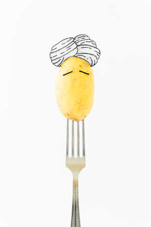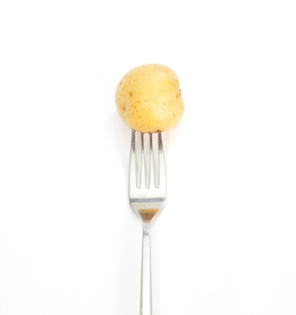 Photo of a potato on a fork isolated on a white background, part of a series.