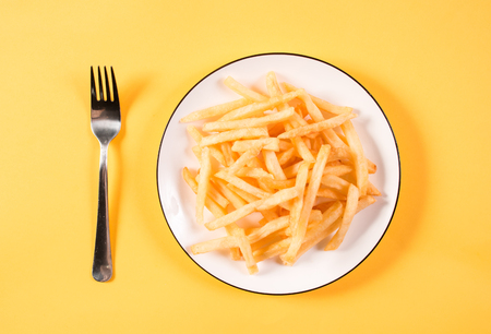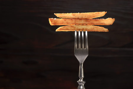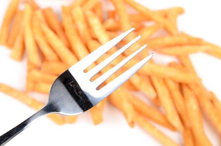 Stack of perfectly french fried on vintage fork floating or flying isolated on clean white background