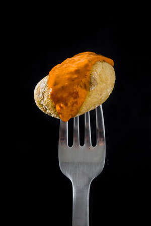 Canarian potato (wrinkled potatoes) With wet sauce on a fork with black background