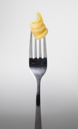 Traditional American Favorite Food Macaroni and Cheese on a Red Fork Isolated on White