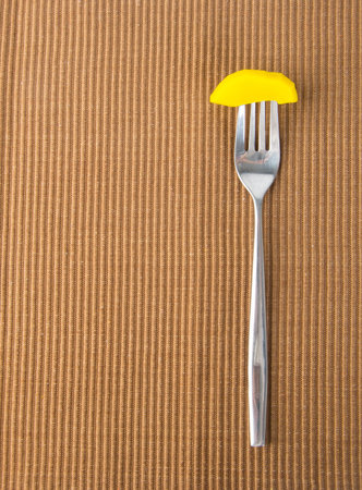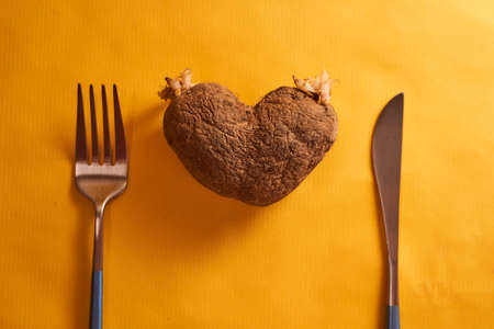 ugly plain potatoes in the shape of a heart on yellow background with fork and knife. High quality photo