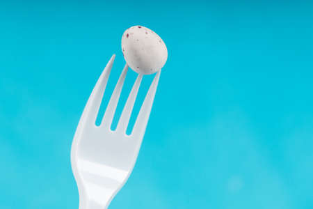 Female hand holds a fork on blue pastel background. Top view. Studio shot