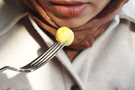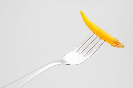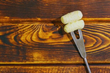 Homemade traditional spanish croquette on a fork on yellow background isolated