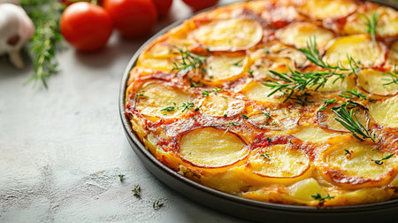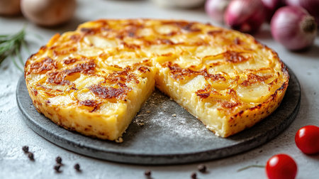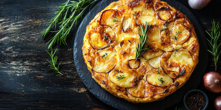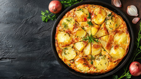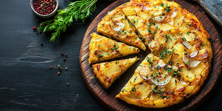 Top view of Spanish tortilla with potatoes and onions, arranged with plenty of room for text.