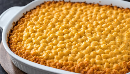 A close-up shot of a freshly baked macaroni and cheese casserole, showcasing the golden brown, bubbly crust and the creamy, cheesy interior. The dish is nestled in a white baking dish, ready to be served and enjoyed.