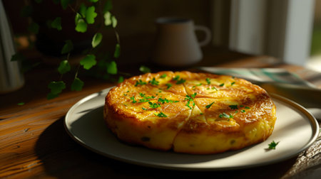Spanish vegetarian cuisine served outside in the morning sunlight includes a portion of homemade, delectable tortilla de patatas with onion