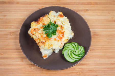 Serving of the gratin made with cauliflower, shrimps, cheese and breadcrumbs, slices of fresh cucumber on the brown dish on a wooden surface, top view