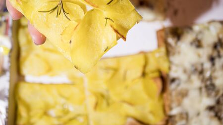 Pizza with potatoes and rosemary. top view