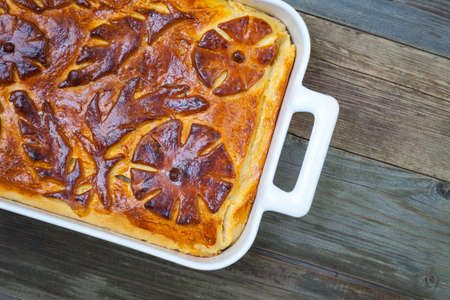 Cheese casserole on a brown plate on a wooden background