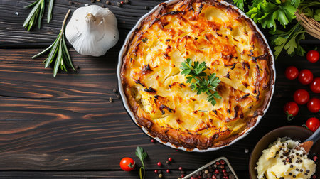 Potato casserole with cheese and herbs on a wooden background
