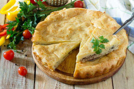 Homemade pie with meat and vegetables on a dark background. Selective focus.