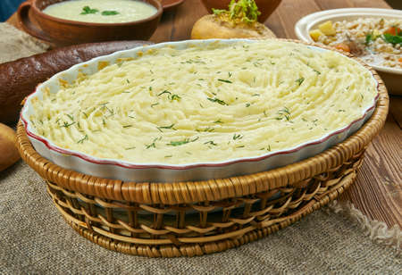 Scottish Potato Pie, Shepherd's Pie, Scottish cuisine, Traditional assorted dishes, Top view.