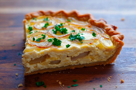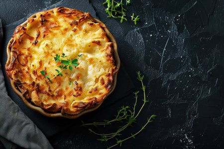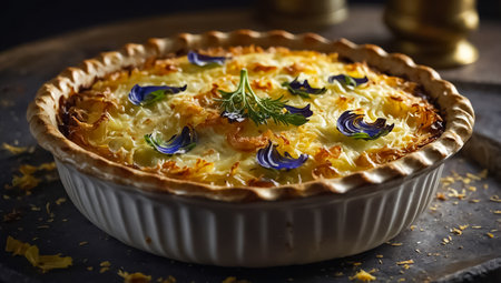 This delectable dish features a golden crust filled with layers of creamy cheese and thinly sliced potatoes, garnished with vibrant green parsley. Perfect for sharing at gatherings.