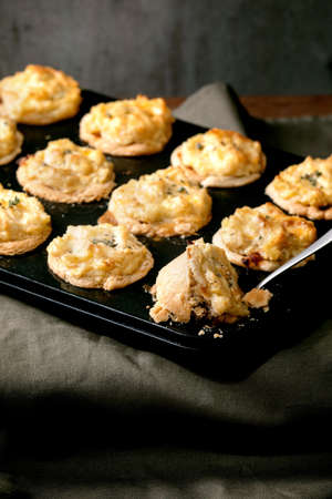 Homemade Mince meat shortcrust pastry mini pies with mashed potato and thyme in black baking tray. Dark linen tablecloth, grey wall at background. Home dinner recipe