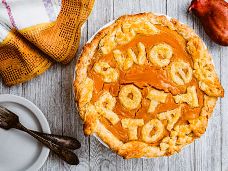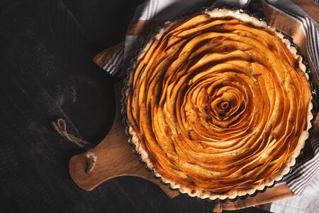 Above view of a sweet potato pie, in shape of a rose flower, on a wooden cutting board, on a rustic black table. Autumn American tart.