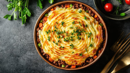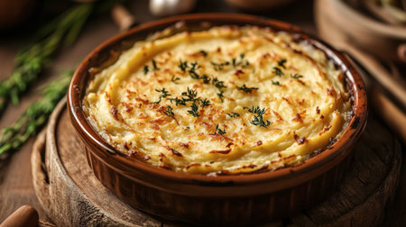 A classic shepherd's pie with a golden mashed potato topping, served in a rustic dish.